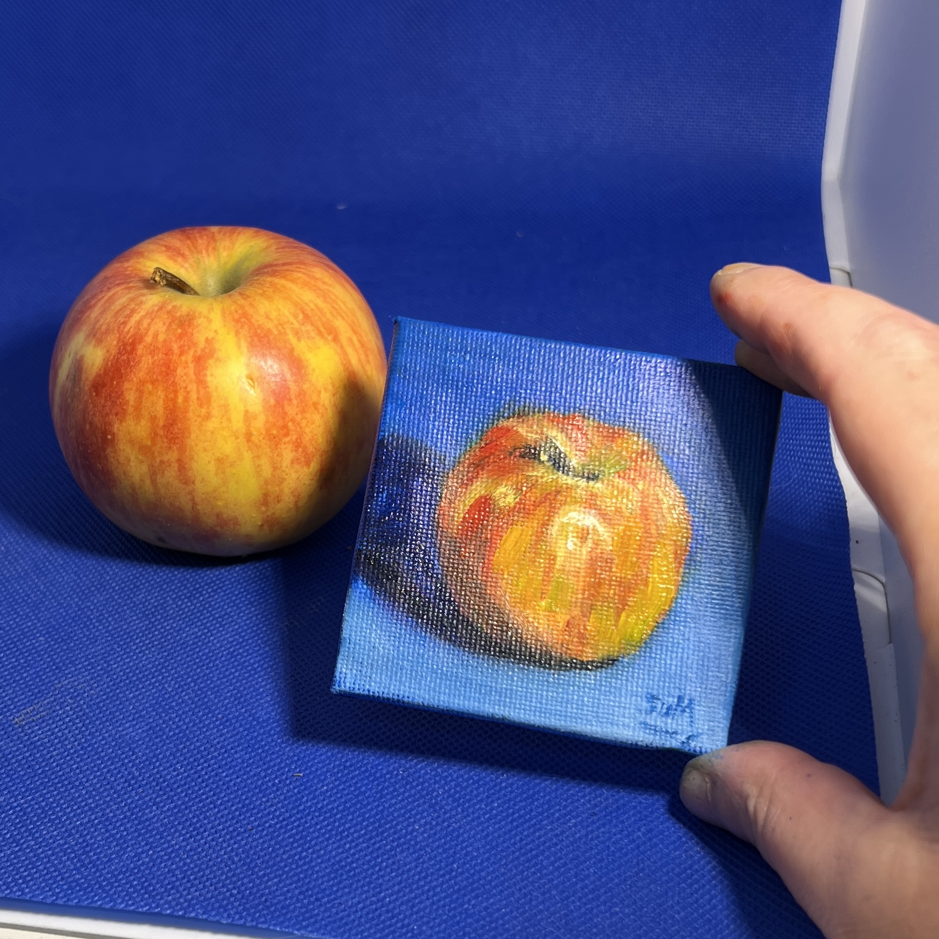 Part of The Minis collection, this original oil painting captures an apple against a rich blue background in a study of light, tone, and colour.