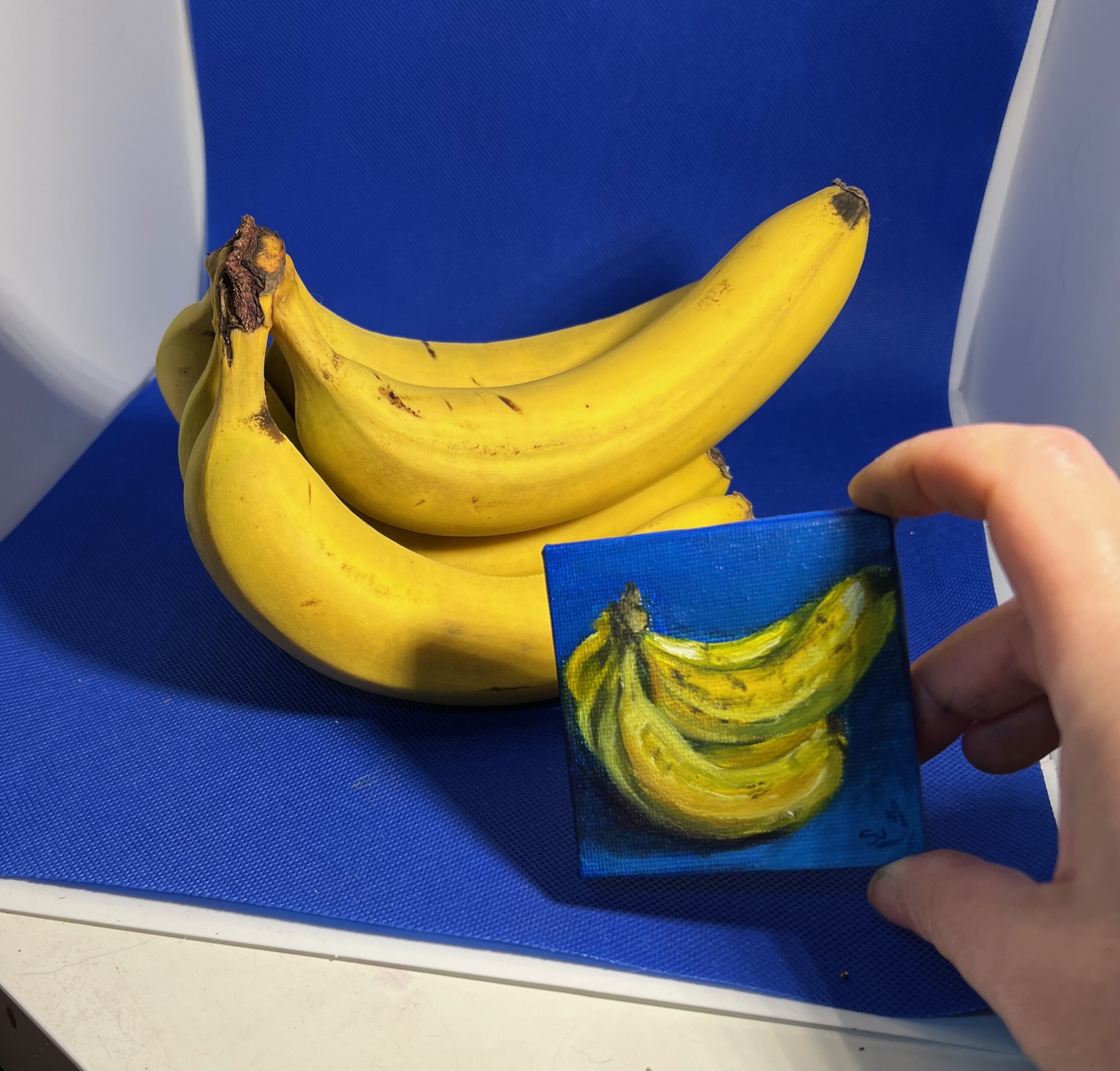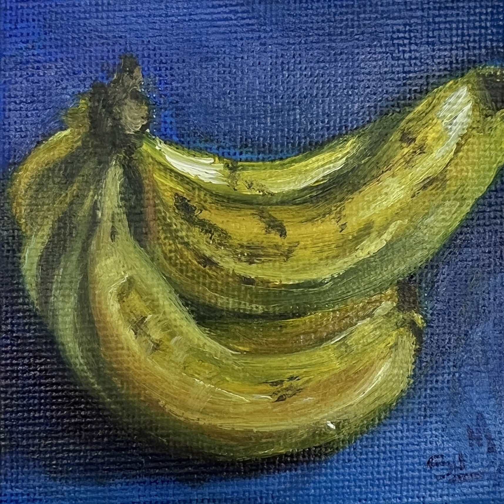 Part of The Minis collection, this original oil painting captures the quiet beauty of a bunch of bananas against a rich blue background.