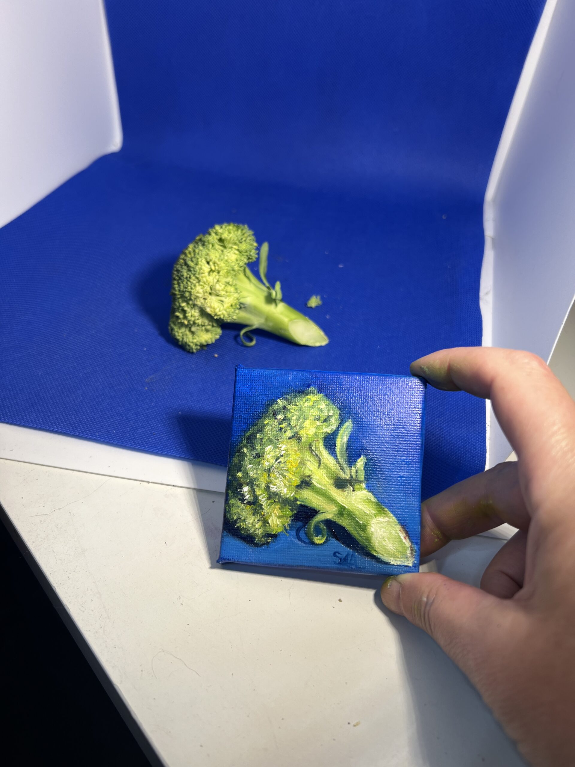 Part of The Minis collection, this original oil painting captures the quiet beauty of a broccoli floret against a rich blue background.