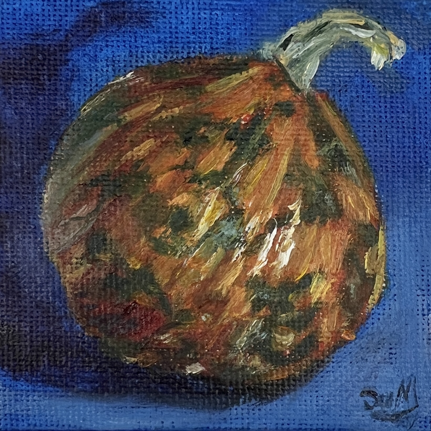Part of The Minis collection, this original oil painting captures a colourful gourd against a rich blue background in a study of light, tone, and colour.