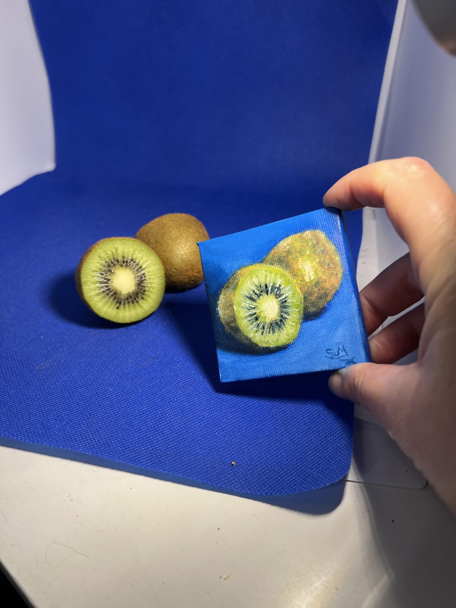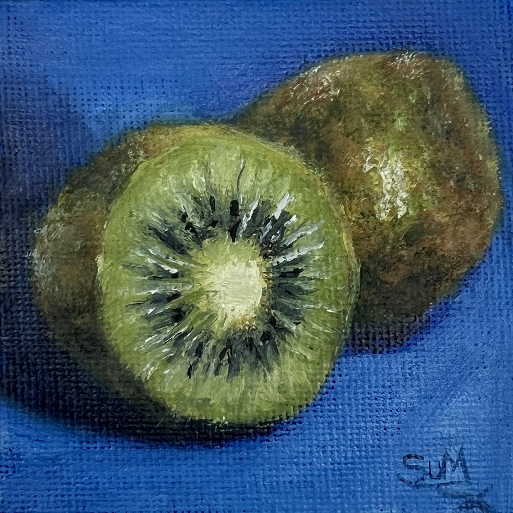 Part of The Minis collection, this original oil painting captures the quiet beauty of a kiwi against a rich blue background.