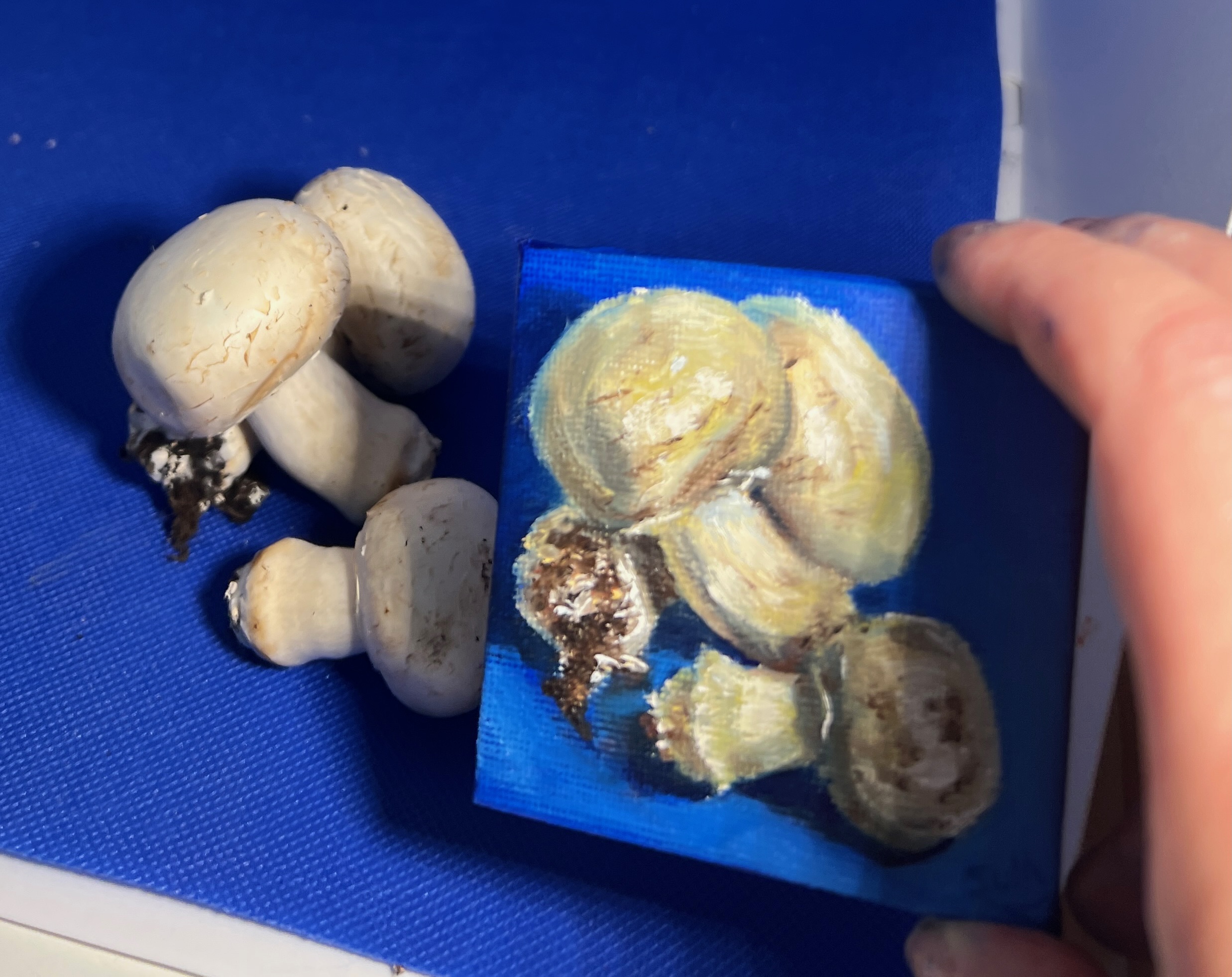 Part of The Minis collection, this original oil painting captures the quiet beauty of some mushrooms (there’s not mush-room here!) against a rich blue background.