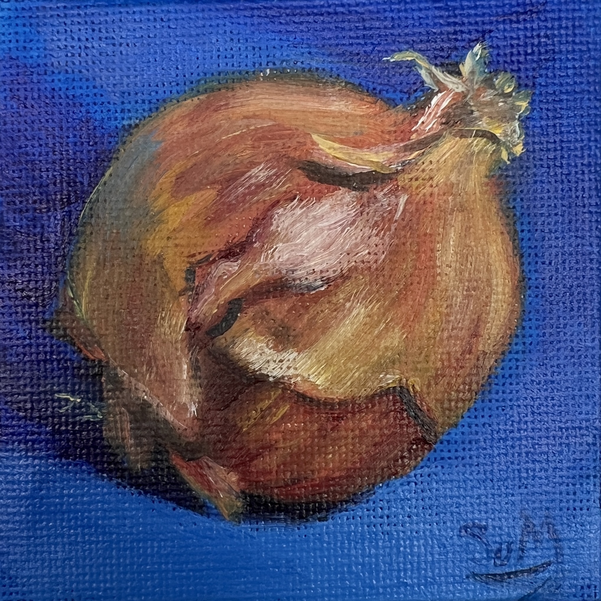 Part of The Minis collection, this original oil painting captures the quiet beauty of an onion against a rich blue background.