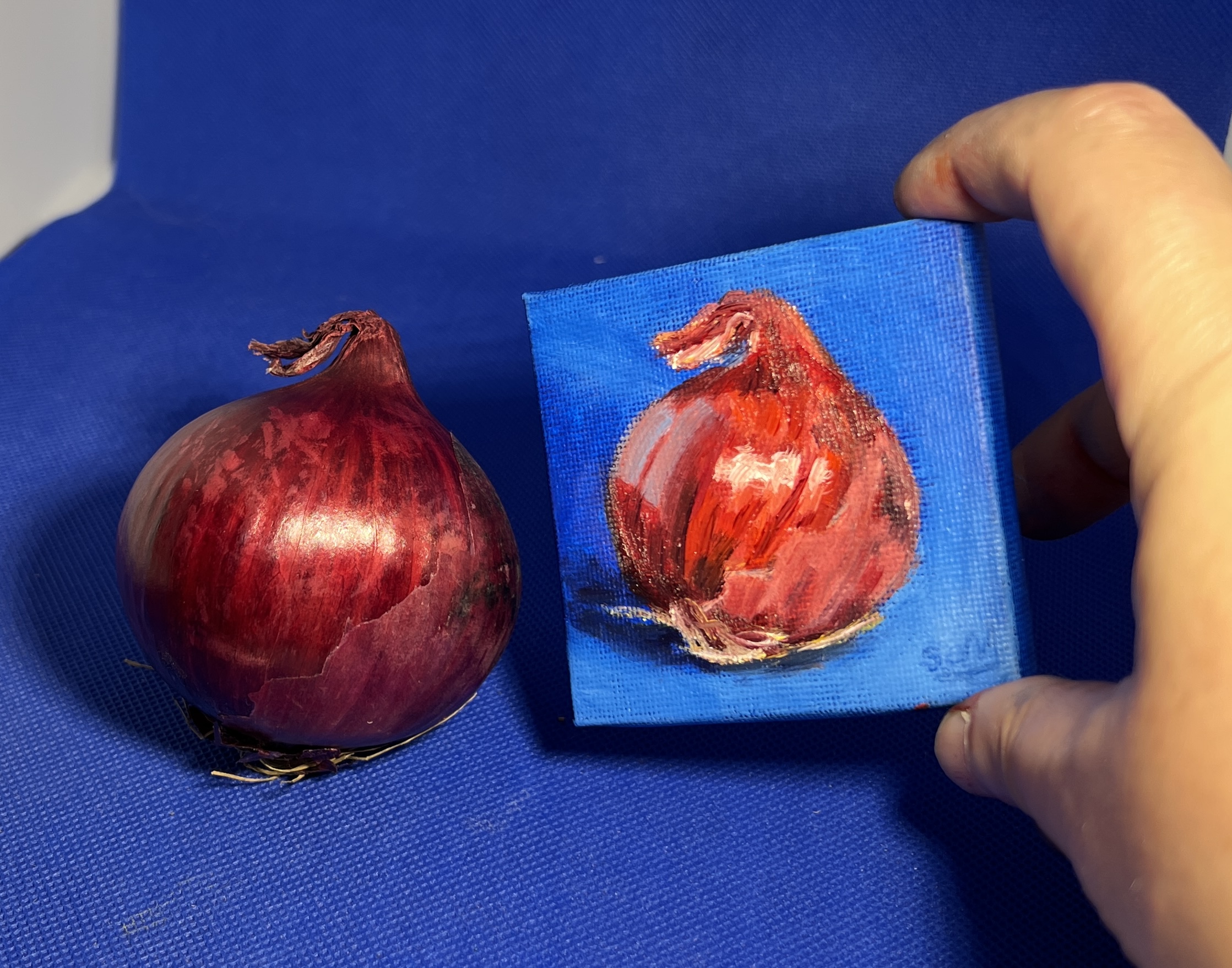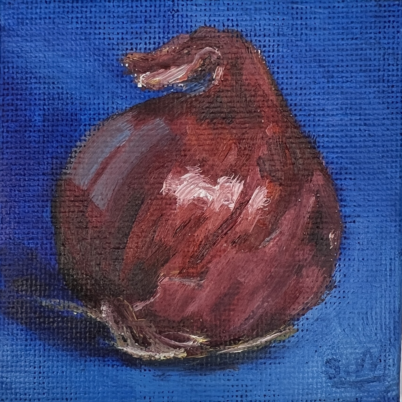 Part of The Minis collection, this original oil painting captures a colourful red onion against a rich blue background in a study of light, tone, and colour.