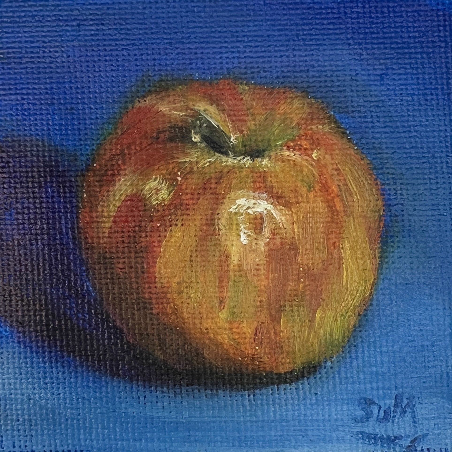 Part of The Minis collection, this original oil painting captures an apple against a rich blue background in a study of light, tone, and colour.