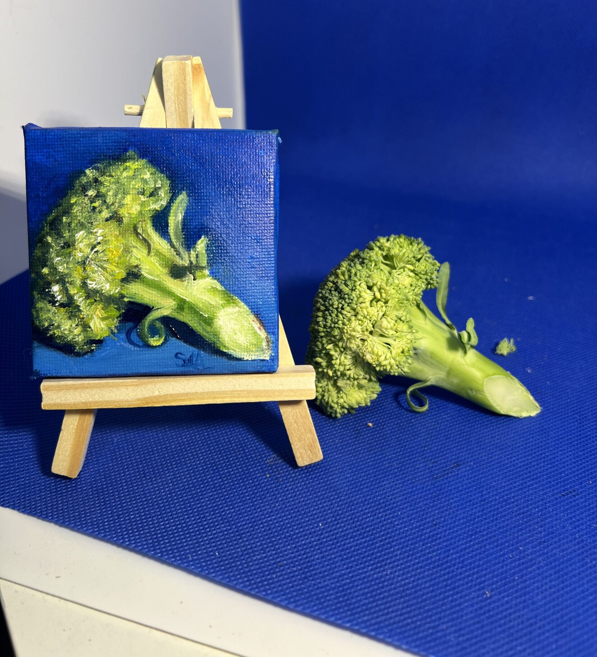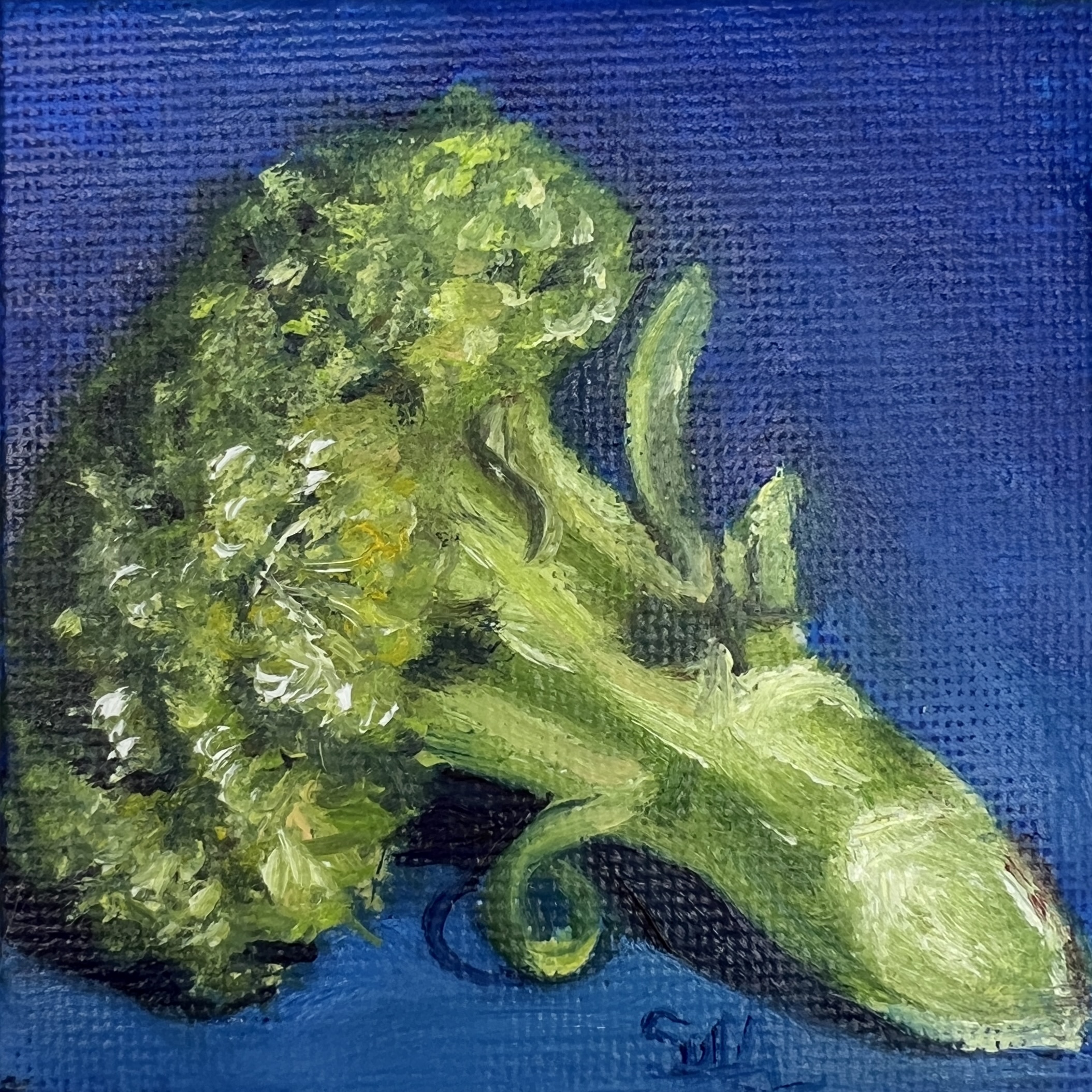 Part of The Minis collection, this original oil painting captures the quiet beauty of a broccoli floret against a rich blue background.