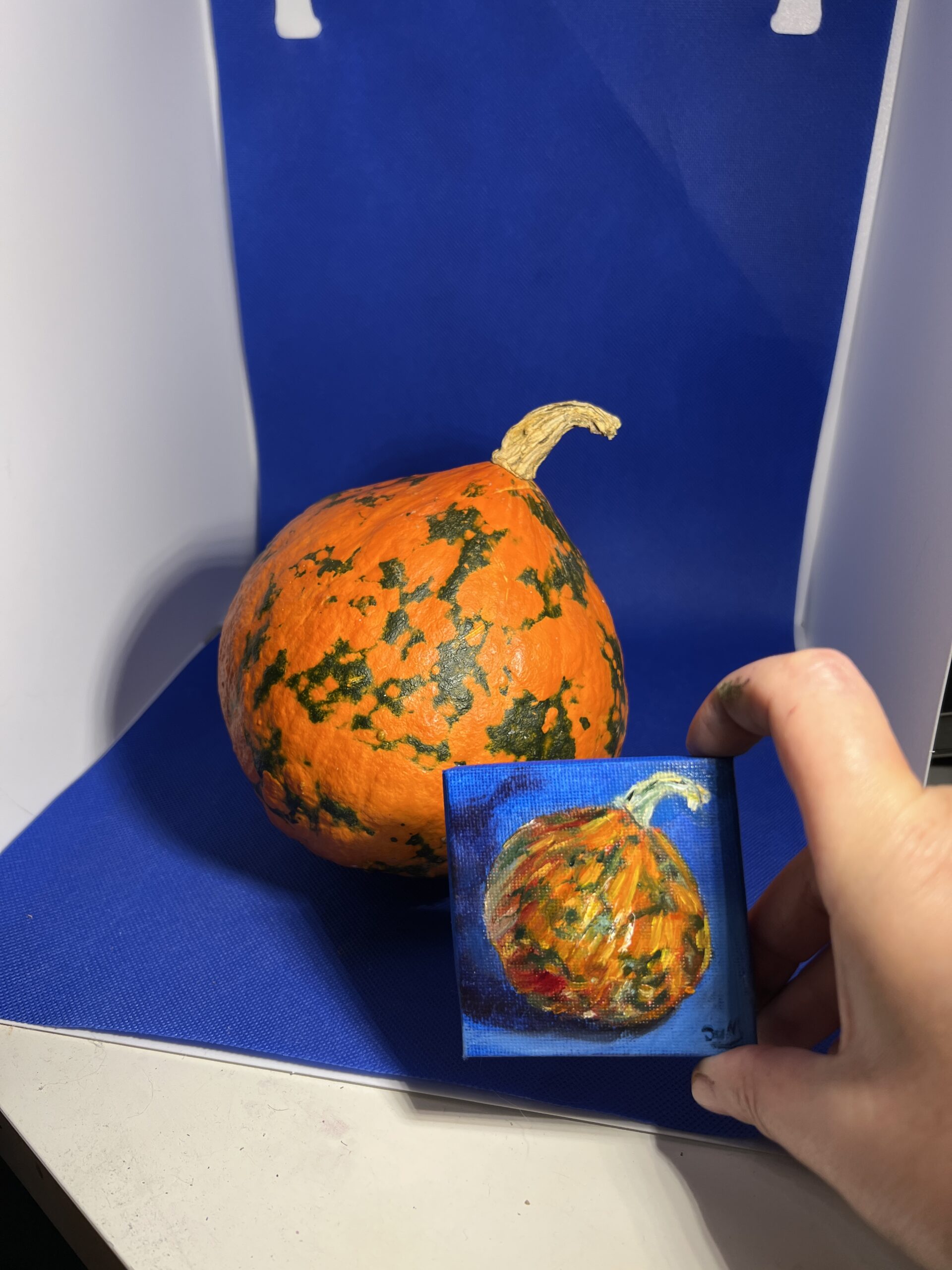 Part of The Minis collection, this original oil painting captures a colourful gourd against a rich blue background in a study of light, tone, and colour.