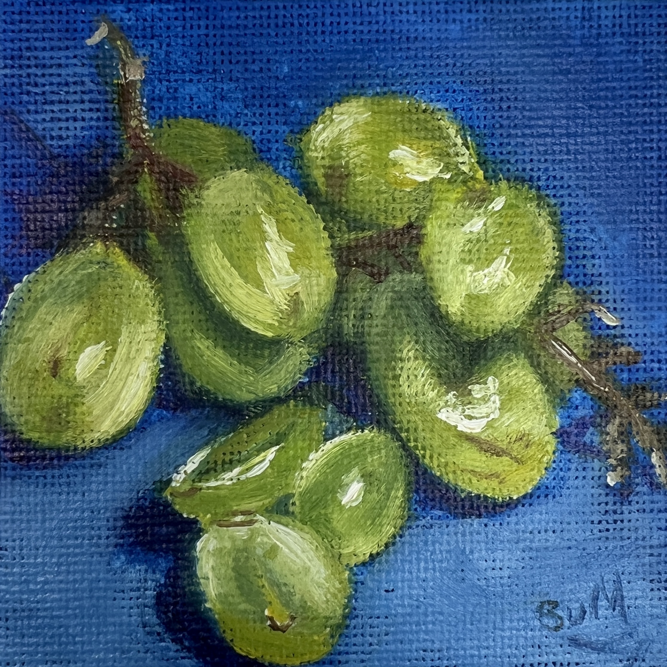 Part of The Minis collection, this original oil painting captures the quiet beauty of some grapes against a rich blue background.