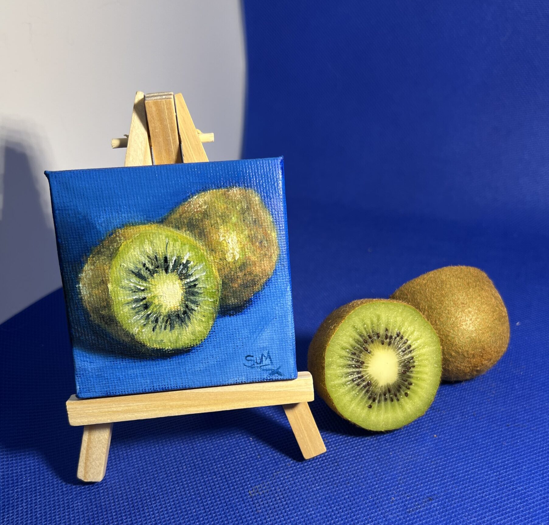 Part of The Minis collection, this original oil painting captures the quiet beauty of a kiwi against a rich blue background.
