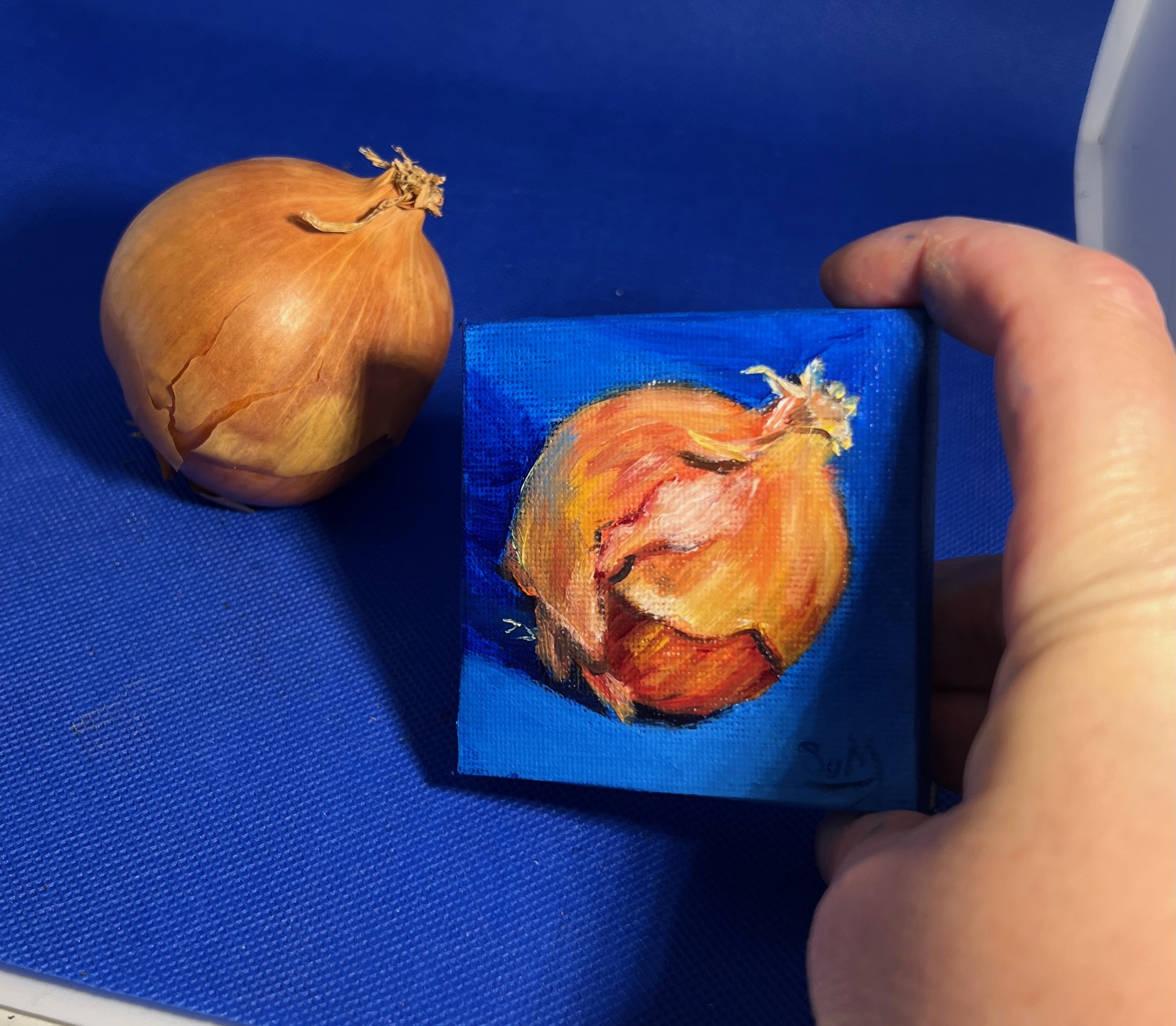 Part of The Minis collection, this original oil painting captures the quiet beauty of an onion against a rich blue background.
