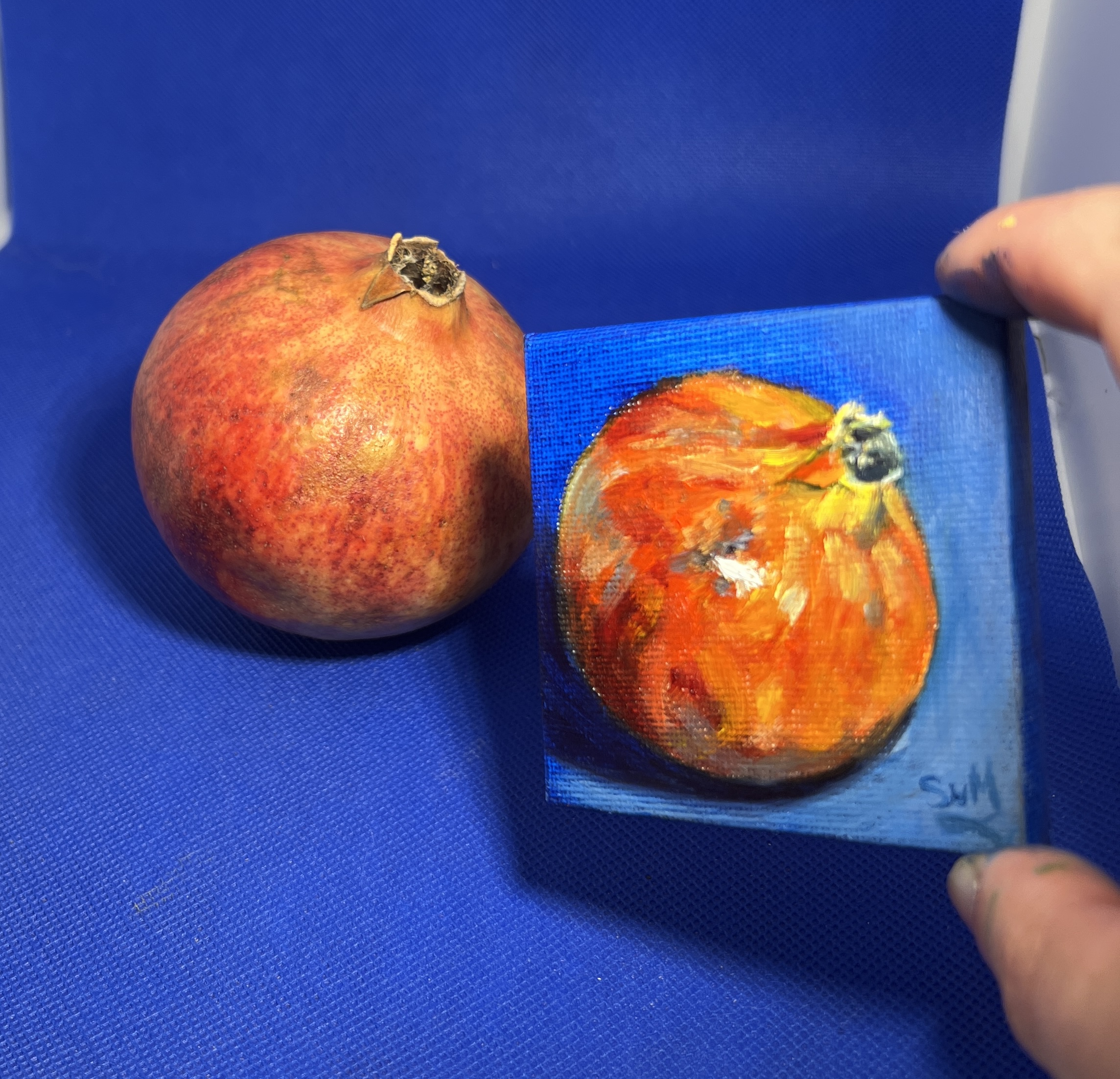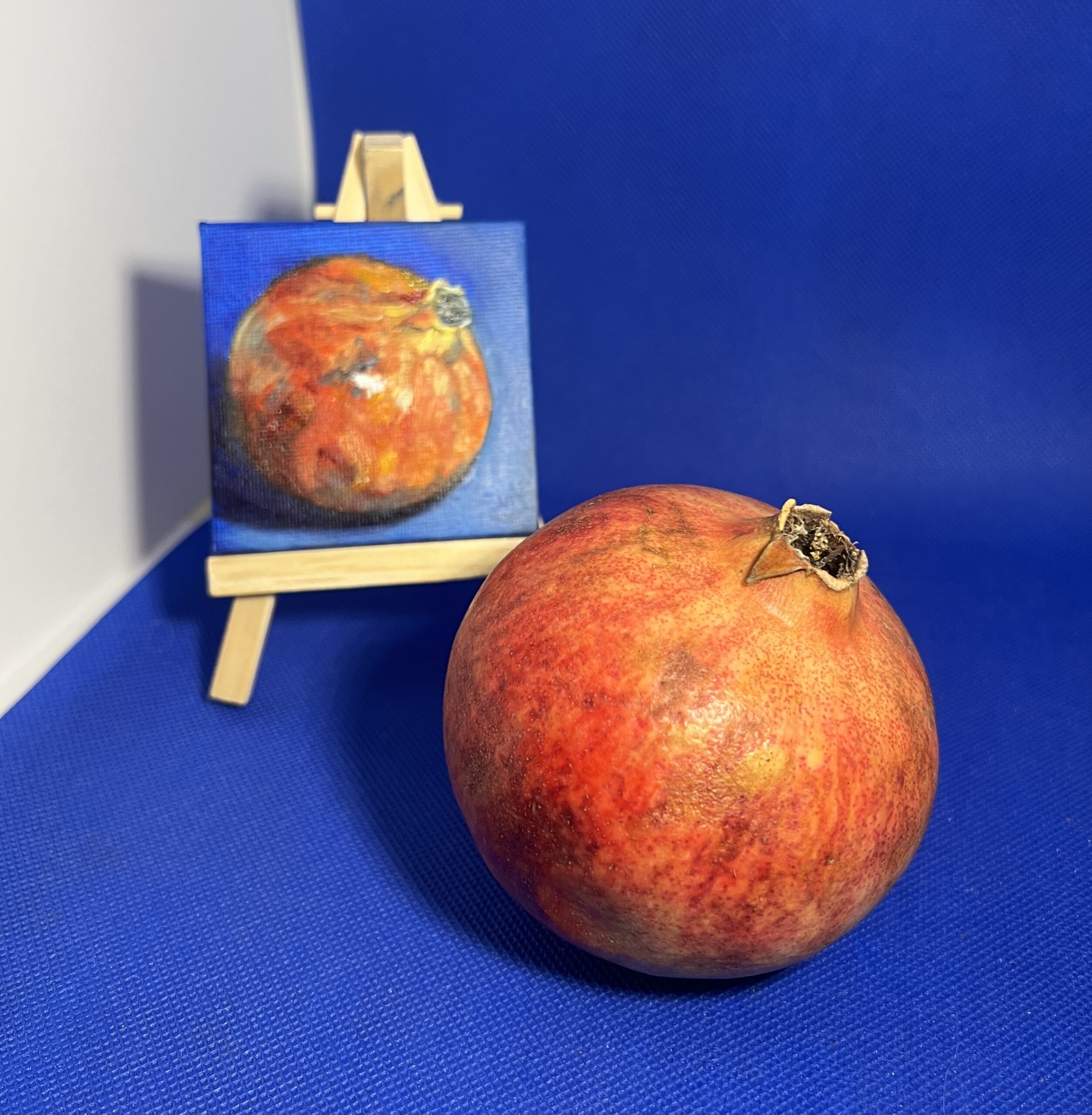 Part of The Minis collection, this original oil painting captures a pomegranate against a rich blue background in a study of light, tone, and colour.